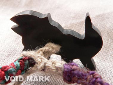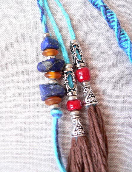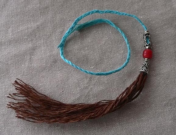 もう一方の編み終わりの端には、細かい三つ編みを幾本か垂らして、ナヴィのアクセサリーっぽくビーズを通し、先に茶色の房を付けるつもり(尻尾の先っぽのイメージ)。